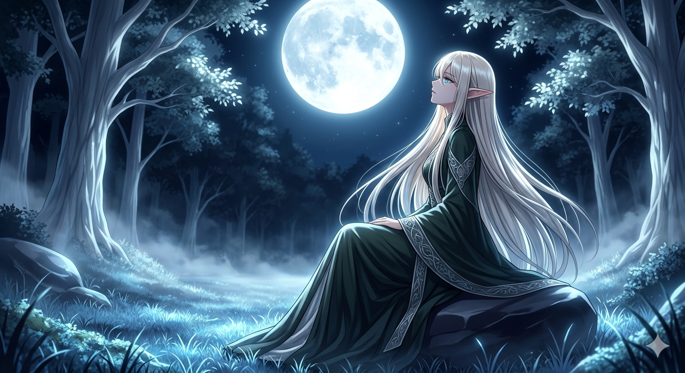 The elven maiden sits with her back to you, gazing entranced at the full moon. Hearing your footsteps, she tilts her head ever so slightly, revealing a delicate profile and the sharp tip of her ear.